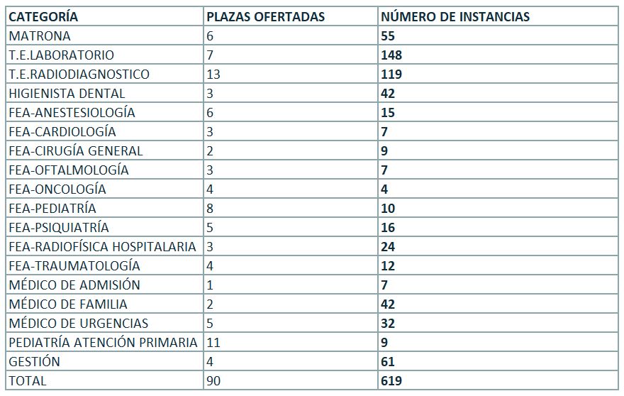 El INGESA ha recibido y procesado un total de 619 solicitudes para las 90 plazas que se ofertan en estas categorías. Las más demandas en función de las plazas ofertadas han sido las correspondientes a Técnico Especialista de Laboratorio (148 solicitudes para 4 plazas ofertadas), Medicina de Familia (42 para 2 plazas), Gestión (61 para 4 plazas), Higienista Dental (42 para 3 plazas), Matrona (55 para 6 plazas) y Técnico Especialista en Radiodiagnóstico (119 para 13 plazas).